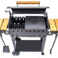 Верхняя крышка, имеющая три степени высоты, позволит вашим блюдам получить насыщенный аромат. Встроенные боковые металлические полки облегчают готовку. Нижняя полка используется для хранения угля или дров. Удобные ручки помогают переносить мангал.